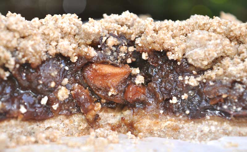 5) Spoon the mincemeat into the base and crumble the remaining shortbread mix over the top. Place back in the oven for another 8 mins.