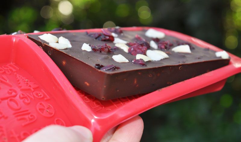Orange Macadamia Nut and Cranberry Chocolate Bark Prep Time: 10 mins Set Time: 4-8 hrs Makes 4 Bars Ingredients: ½ Cup Chocolate Drops - I use RealFoodSource Coconut Sugar Chocolate Drops 2 tbsps. Cashew Nut Butter or you can make your own - recipe here :) 1 tsps. Powdered Vanilla 2 tbsps. Maple Syrup 1 tsp Orange Oil ½ Cup Chopped Macadamia Nuts ½ Cup Dried Cranberries Instructions: 1) Melt the chocolate drops in a bowl over a saucepan of boiling water or in the microwave. 2) Remove from heat and slowly stir in cashew nut butter, vanilla, maple syrup and orange oil until a smooth liquid chocolate is formed. 3) Paint the bottom of the mould with some of the chocolate mixture so that all the recesses in the bottom of the moulds are filled. 4) Stir in the macadamia nuts and cranberries reserving some of both for decorating the bars. 5) Pour the chocolate mixture into the moulds. Press the remaining nuts and cranberries gently into the top of each mould as decoration. Leave to set at room temperature for 2 hours and then place into the freezer for 4-8 hrs.